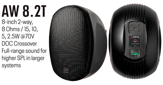 Ashly AW speakers are made from high-impact-resistant resin with detachable metal grilles. They are suitable for both indoor and outdoor use with IP52 (dripping water @ 15˚) or IP54 (splash at any angle). All four models come with tilt / swivel brackets and 2-way models come with safety tethers with safety cord, and are also surface mountable.