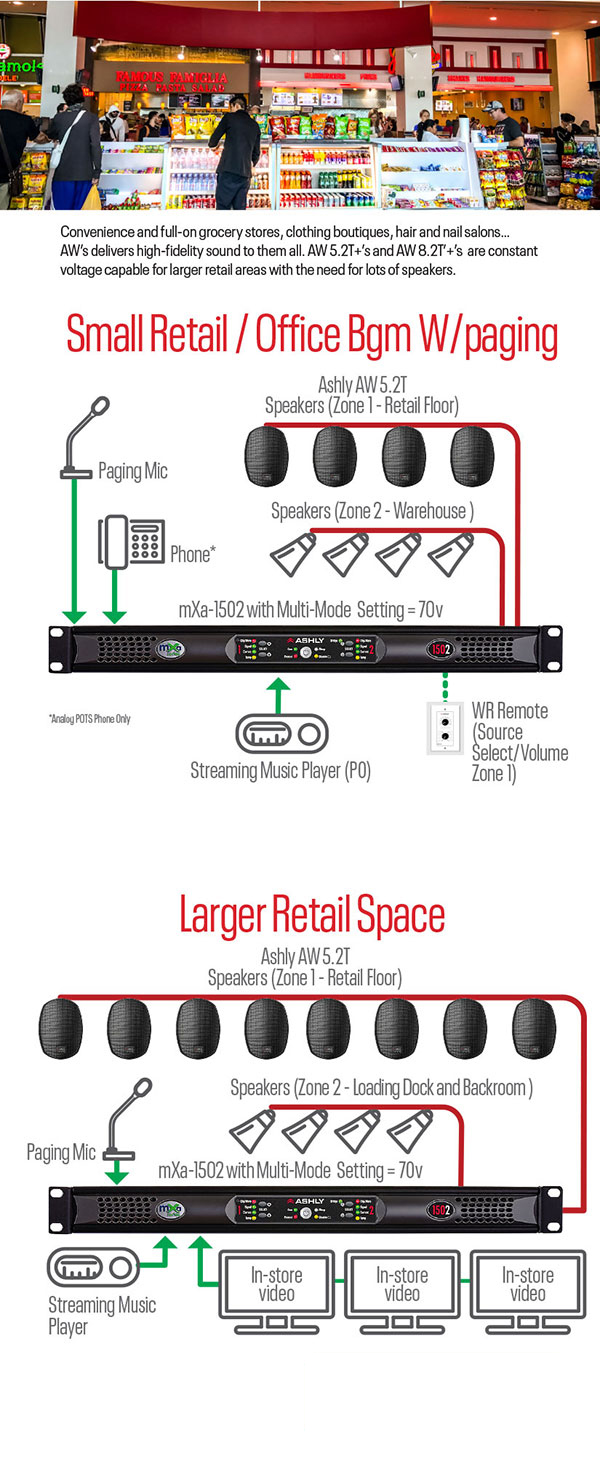 Convenience stores, clothing boutiques, hair and nail salons…AW’s delivers high-fidelity sound to them all. AW 5.2T+’s and AW 8.2T’+’s are constant voltage capable for larger retail areas with the need for lots of speakers.