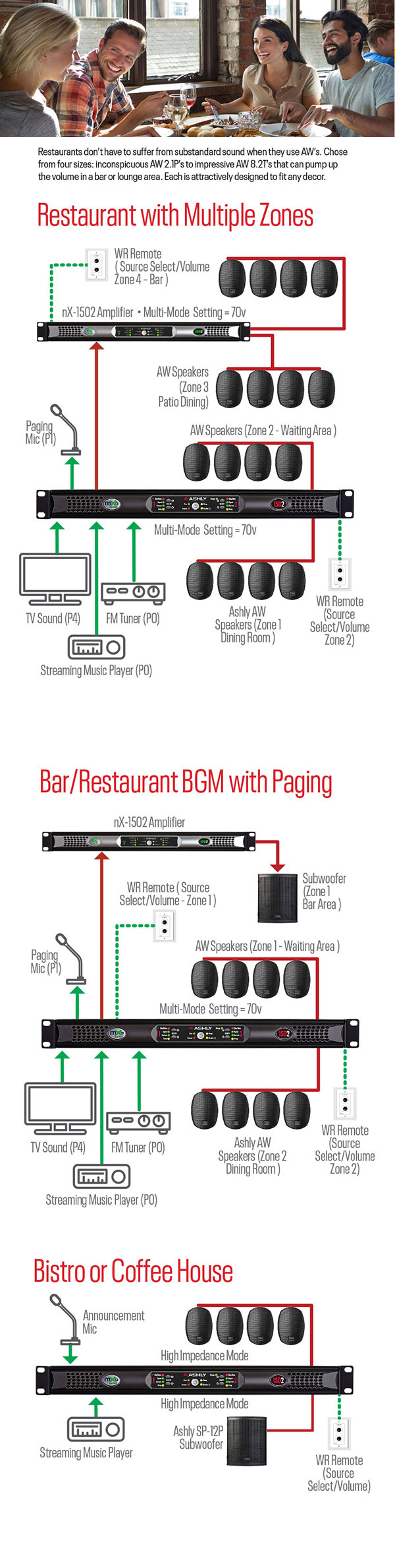 Restaurants don’t have to suffer from substandard sound when they use AW’s. Chose from four sizes: inconspicuous AW 2.1P’s to impressive AW 8.2T’s that can pump up the volume in a bar or lounge area. Each is attractively designed to fit any decor.