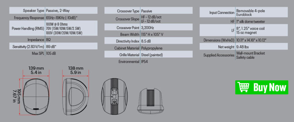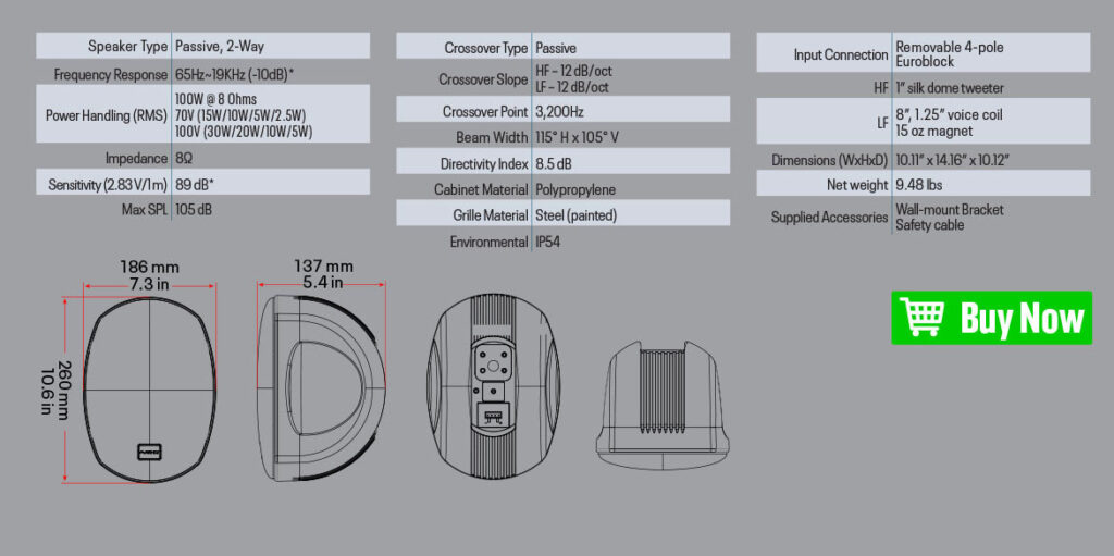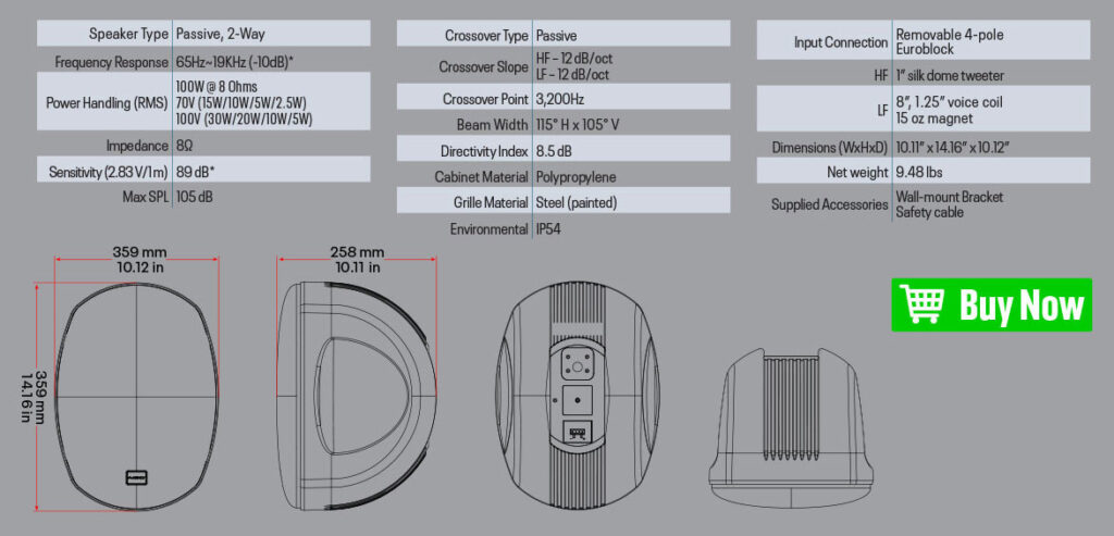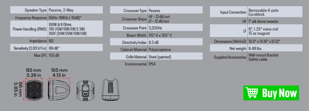 Directive Optimization, a new, proprietary approach to crossover design, significantly improves vertical axis response. More listeners on the extreme left and right can hear the spoken word better. Music in a restaurant or bar is more immersive and less directional. DOC avoids the lock-step “studio monitor” configuration that is less than optimal for longer-throw applications and creates a noticeably wider sweet spot that is perfect for speech throughout a room, patio or bar area.
