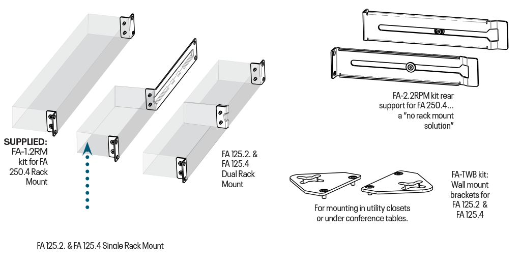 • 1U rack kit for one FA-250.4, or two FA-125.2s or FA-125.4s side-by-side (sold separately)