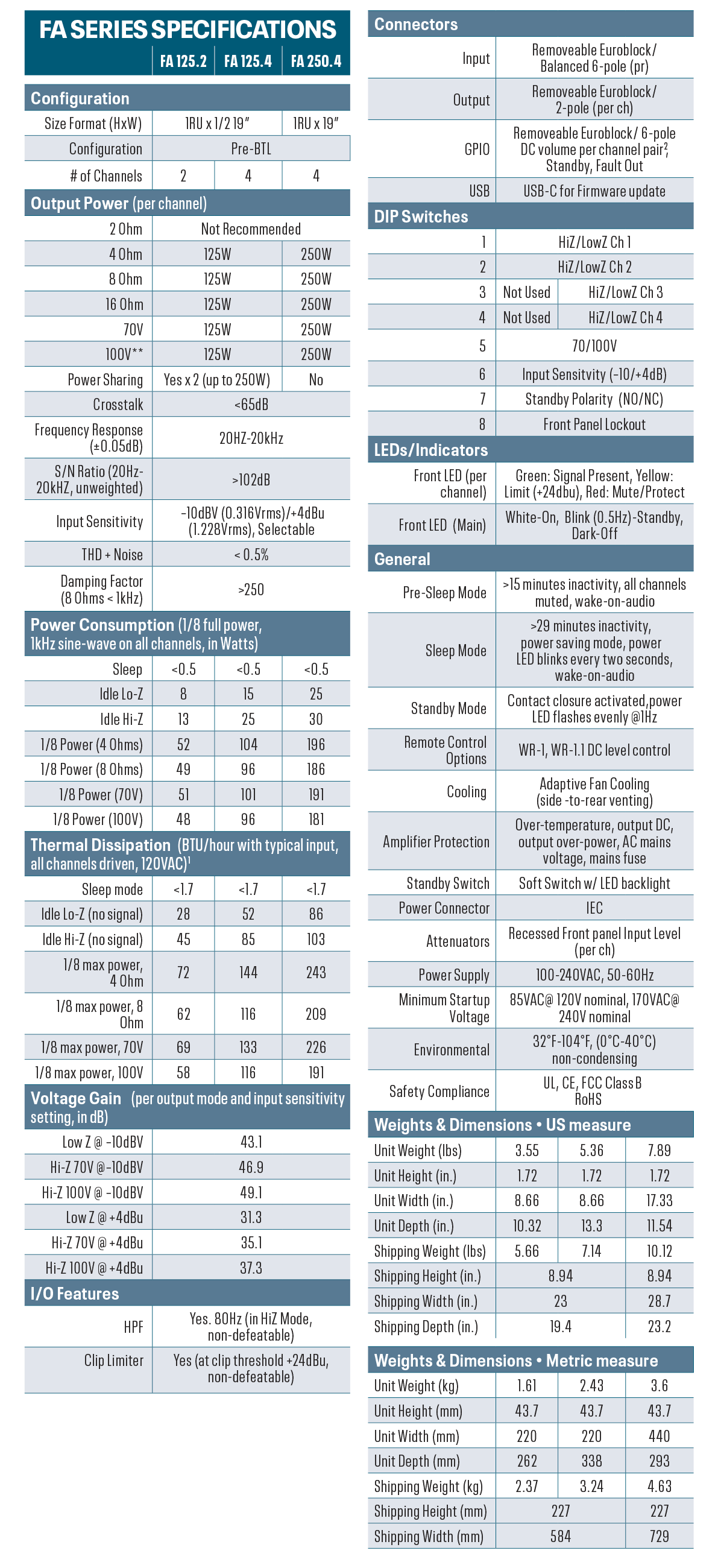 The half- and one-rack-space size FA Series high-density Class D amps belie their output: Up to 125 W x 4 in a half rack space…up to 250 W x 4 in one rack space!
