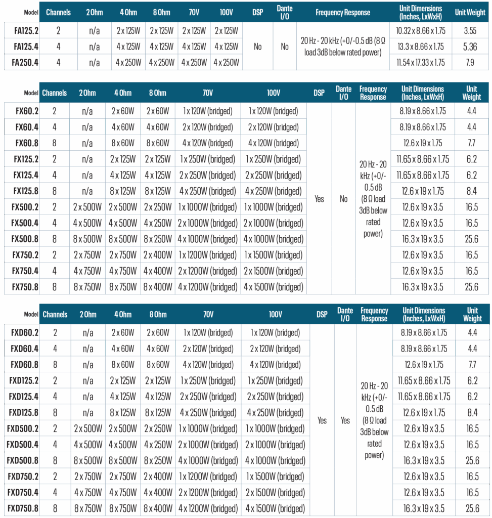 With 24 total models to choose from starting at 2 x 60W in a half rack unit to 8 x 750W in a 2RU unit, there’s an FX that will fit just about any project.