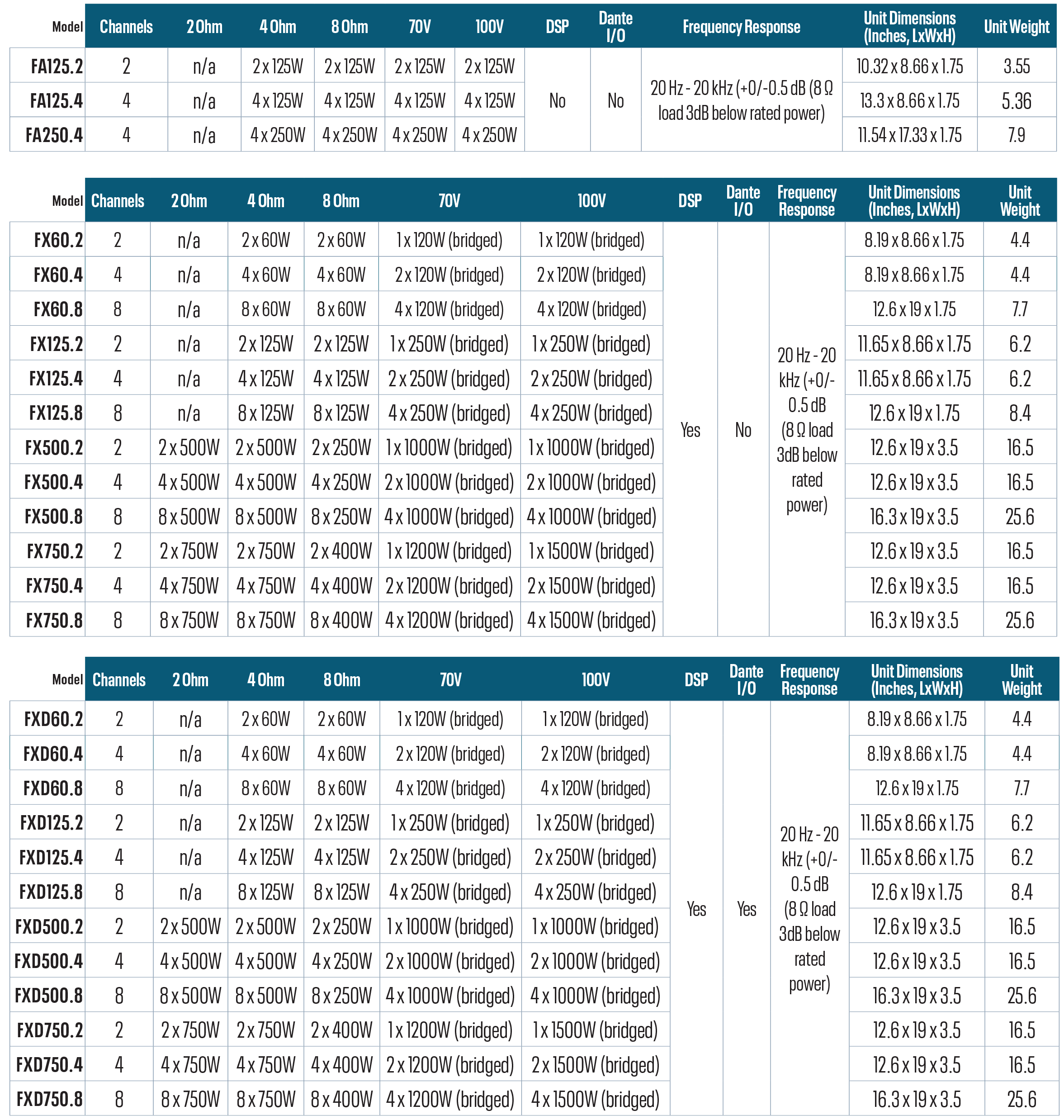 With 24 total models to choose from starting at 2 x 60W in a half rack unit to 8 x 750W in a 2RU unit, there’s an FX that will fit just about any project.