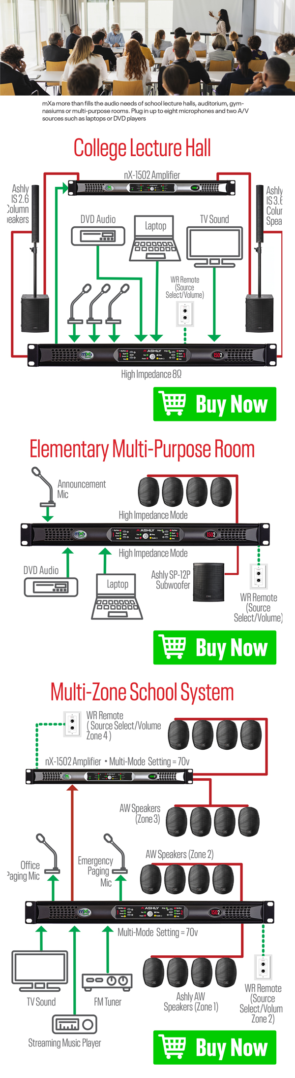 mXa more than fills the audio needs of school lecture halls, auditorium, gymnasiums or multi-purpose rooms. Plug in up to eight microphones and two A/V sources such as laptops or DVD players.