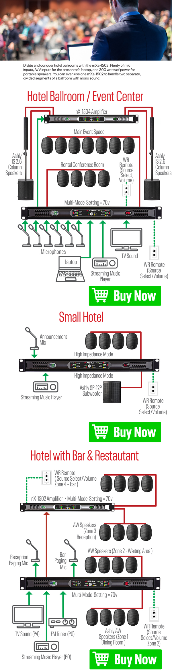 Select inputs, mix (or automix) and process them with full DSP including EQ, ducking, and compression/limiting, then route them via low-impedance or constant voltage amplification to multiple zones.