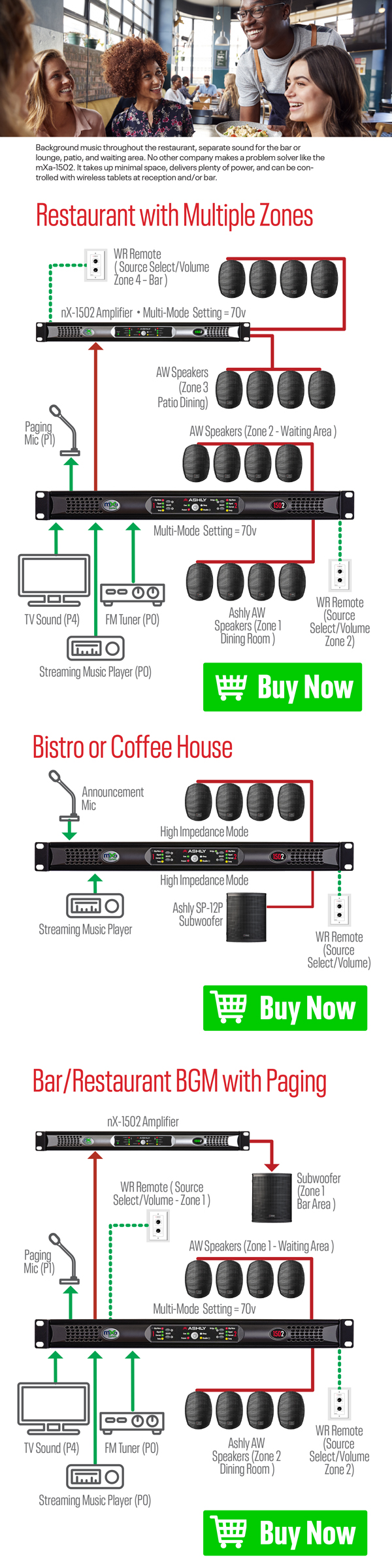 Background music throughout the restaurant, separate sound for the bar or lounge, patio, and waiting area. No other company makes a problem solver like the mXa-1502. It takes up minimal space, delivers plenty of power, and can be controlled with wireless tablets at reception and/or bar.