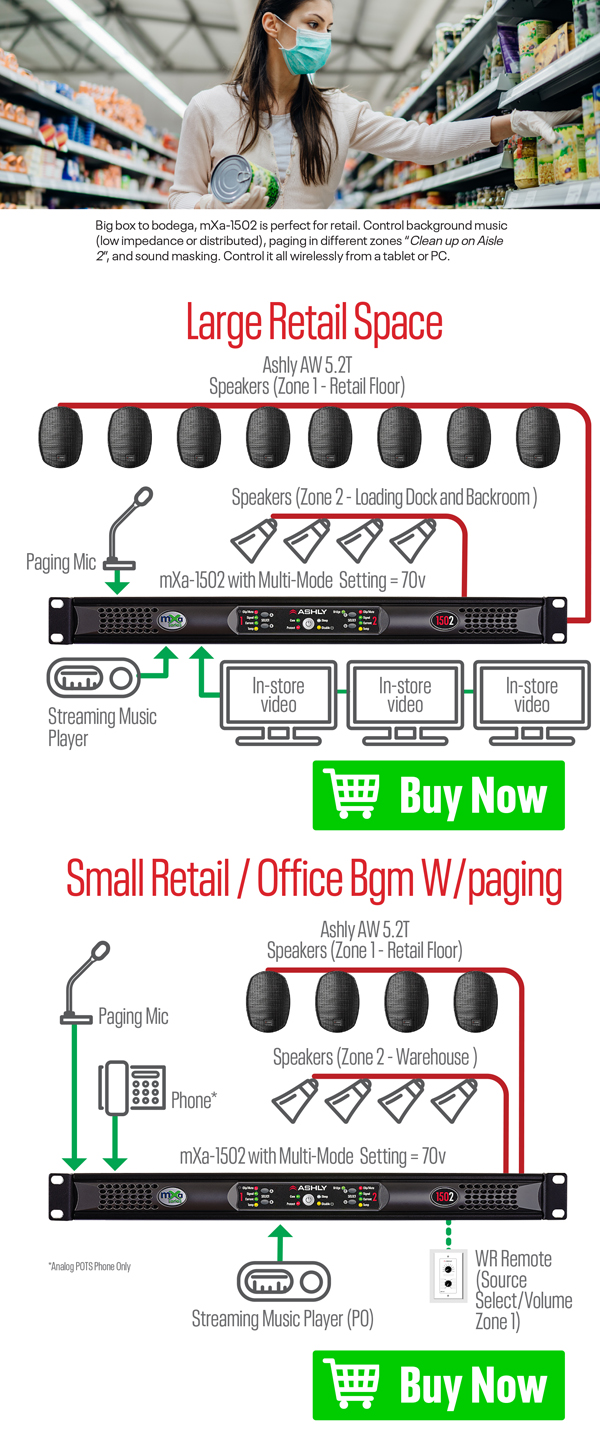 Big box to bodega, mXa-1502 is perfect for retail. Control background music (low impedance or distributed), paging in different zones “Clean up on Aisle 2”, and sound masking. Control it all wirelessly from a tablet or PC.